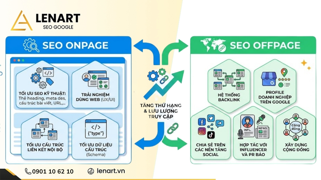 SEO Onpage và SEO Offpage là hai “mắt xích” sống còn quyết định sự thành bại của một chiến dịch tối ưu hóa công cụ tìm kiếm. Trong khi Onpage đóng vai trò hoàn thiện nội lực và trải nghiệm người dùng, thì Offpage lại là đòn bẩy uy tín giúp website khẳng định vị thế trên bảng xếp hạng Google. Vậy làm thế nào để kết hợp nhịp nhàng bộ đôi này nhằm bứt phá lưu lượng truy cập bền vững? Cùng Lenart – Công ty SEO Google chuyên nghiệp UY TÍN HCM tìm hiểu lộ trình xây dựng chiến lược SEO tổng thể, từ tối ưu cấu trúc dữ liệu bên trong đến thiết lập hệ thống thực thể vững chắc bên ngoài.